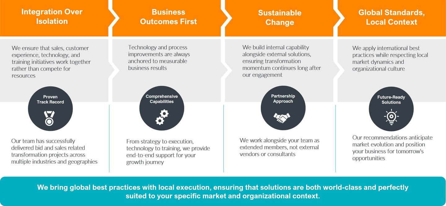 We are not a slide-driven consulting firm. We work hands-on with leadership and frontline teams to diagnose how sales and service really operate, where value is being lost, and what needs to change. Global best practices are used as reference points, not templates - adapted to your market, maturity, regulatory environment, and organisational realities.