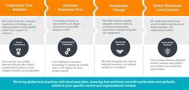 Successful transformation is never plug-and-play. It requires deep understanding of your customers, your revenue model, your team capabilities, and your competitive dynamics. We combine that insight with proven frameworks, data-driven governance, and enabling platforms such as Salesforce to build solutions that are executable, adopted, and sustainable in your world.